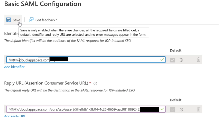- Enter the Identifier (Entity ID) and Reply URL (Assertion Consumer Service URL). These values should be provided by your account management team or Cloud Operations. The fields displayed are examples only.