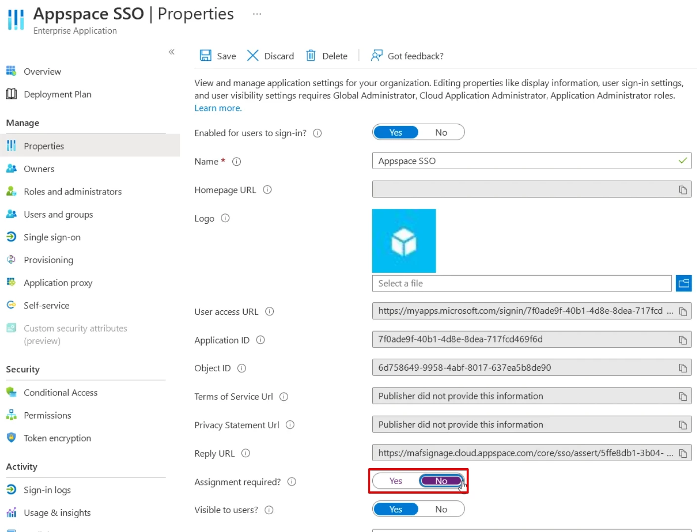 - Navigate to the Properties menu. For the Assignment required setting, choose No if all users should have access. If specific user assignment is required, leave this set to Yes (manual assignment is outside the scope of this guide).