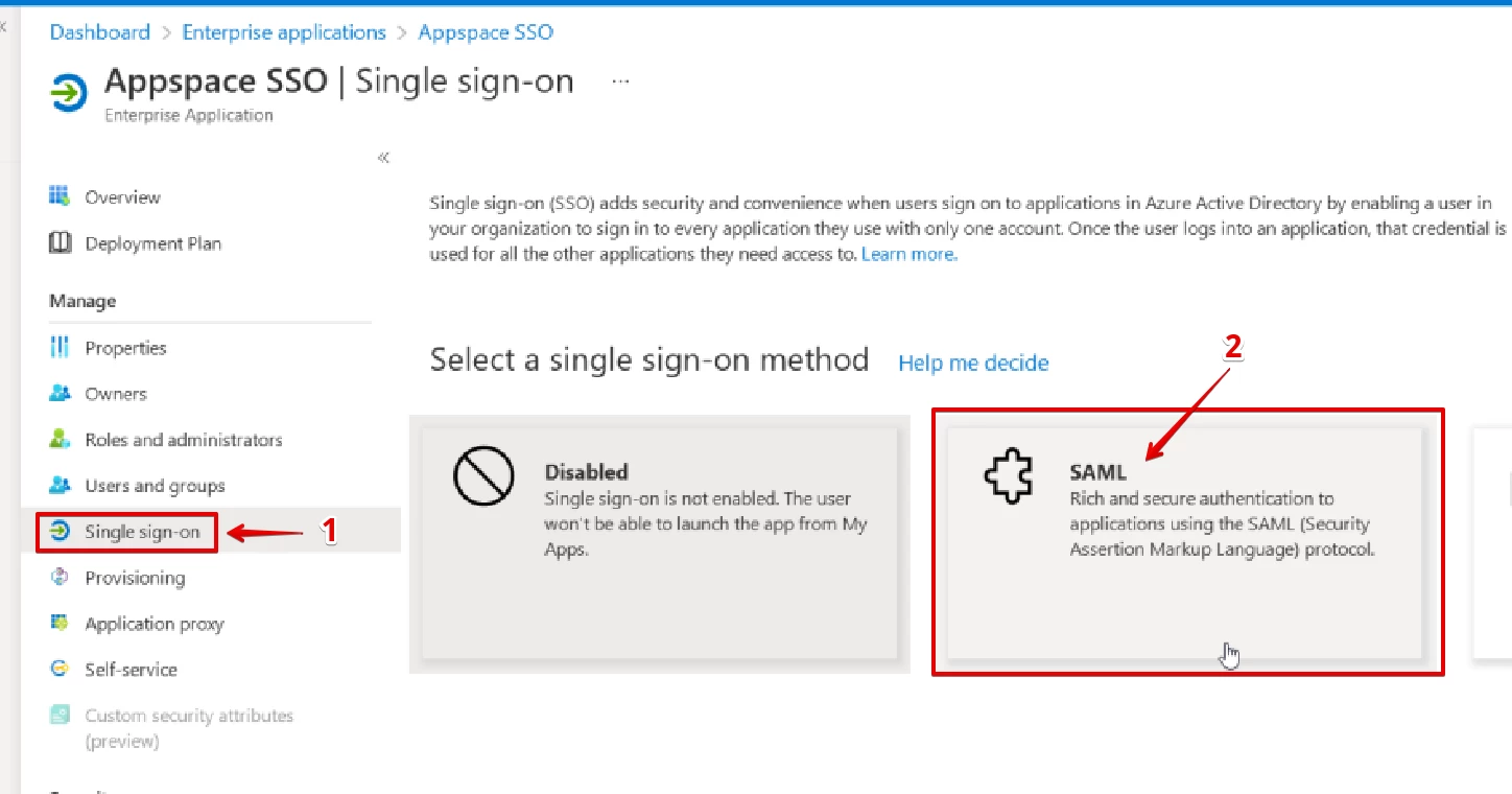Click on Single sign-on from the application's left-hand menu. Select SAML as the single sign-on method.