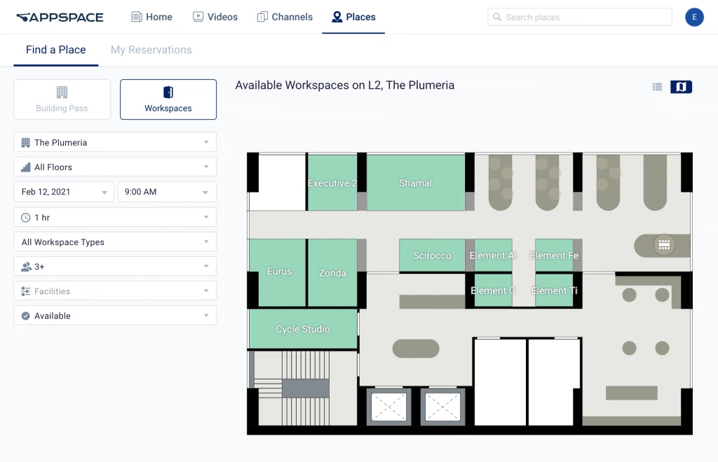 If your Appspace account is configured with space reservation and management, users will also be able to reserve building passes, view available workspaces, and make workspace reservations using the Employee View.