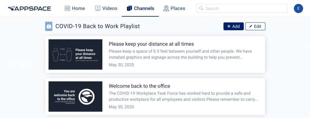 - Channels can be published to personal devices and apps for people, or workplace devices like TVs, collaboration displays, and other physical endpoints.