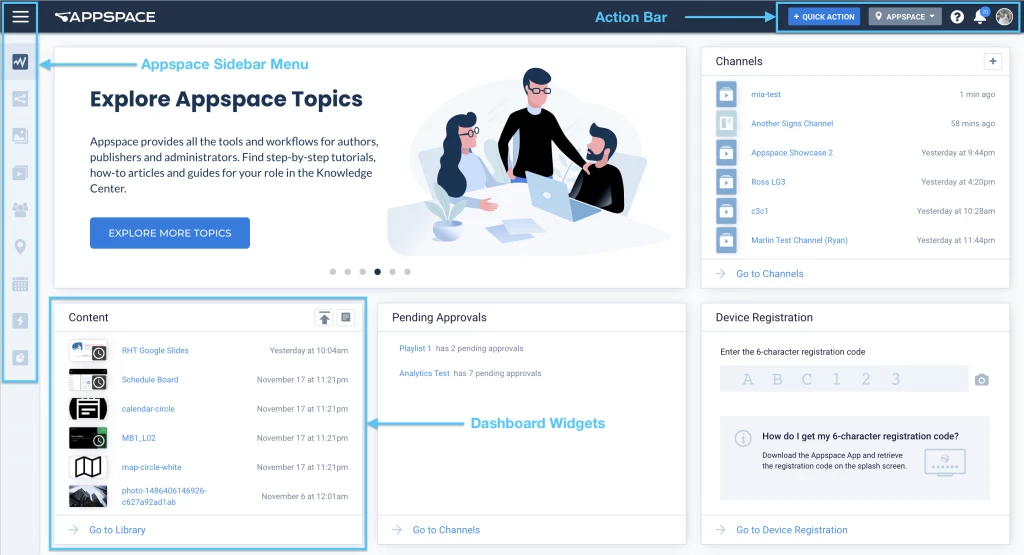 - All of the primary workflows can be accessed through the Appspace Sidebar Menu.