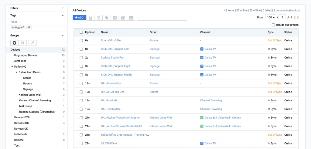 - The Devices workflow is where you manage all of your devices and the organization of your devices and device groups within one or more locations. You can register devices and categorize them using device groups and tags. You can also set which devices get to see which channels, and preview what has already been assigned to any of the registered devices in your location.