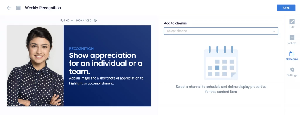 For content creators, Appspace has a collection of ready-to-use card templates and feeds that you can use for company messaging and communications. Card templates are designed using HTML/CSS, and can be edited and customized with your own messaging and branding using built-in tools in the console. You also have the option to upload your own image and video content.