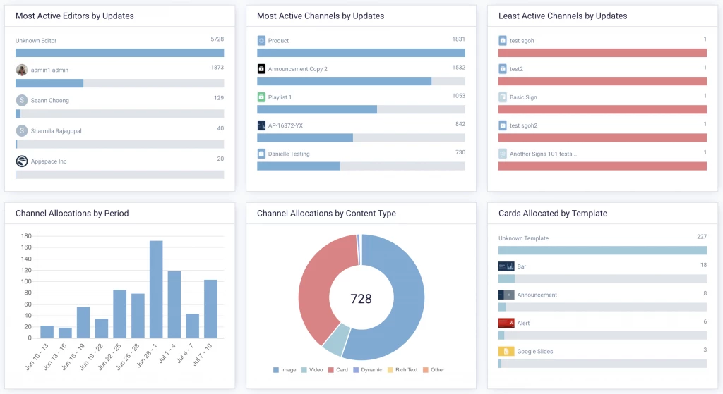 - Analytics shows console usage statistics across content, channels, apps, devices and users.