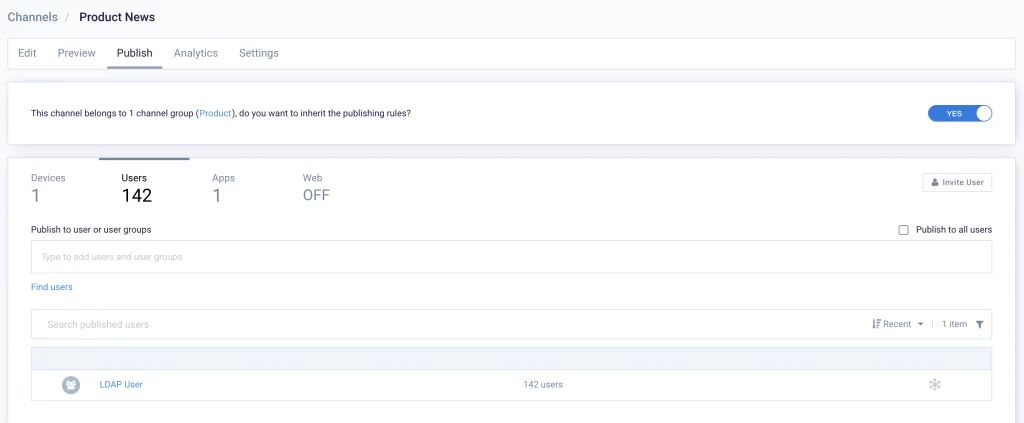 Helpful tip: If you would like to see how content in the channel appears when it gets published before anyone else sees it, you can publish the channel just to yourself first. When you’re happy with how it looks, you can then expand the channel’s audience by adding the desired users and user groups.