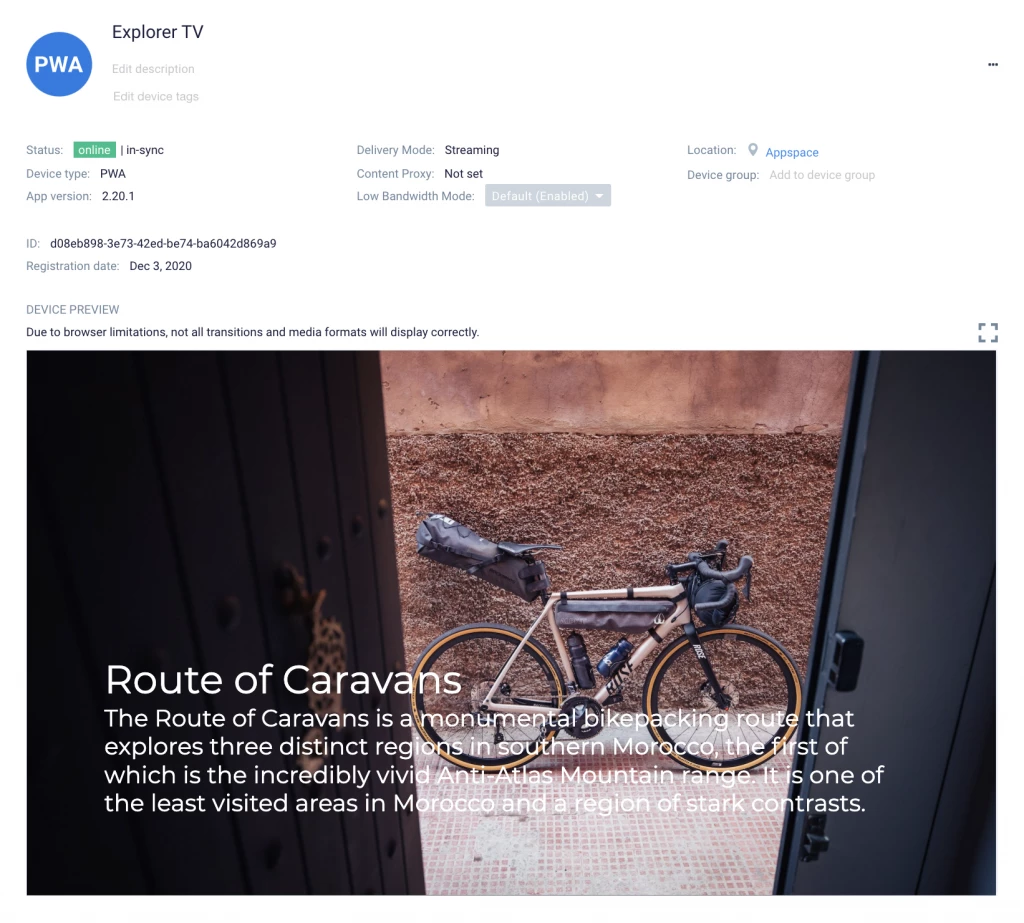 Once you have added all your devices for publishing, they will appear in the table below. You can quickly perform a device preview for each device to monitor what’s playing. Simply click on the name of the device in the table to see the Device Overview overlay. A preview of your channel will appear in the overlay for you to monitor.