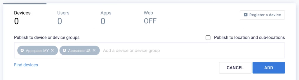 Click on Find devices to view the list of available devices within the location. By now, you should know which devices you want to publish to based on the information you have received from your organization’s IT/Location Admin. Use the search field to look for specific devices, and select one or more from the list.