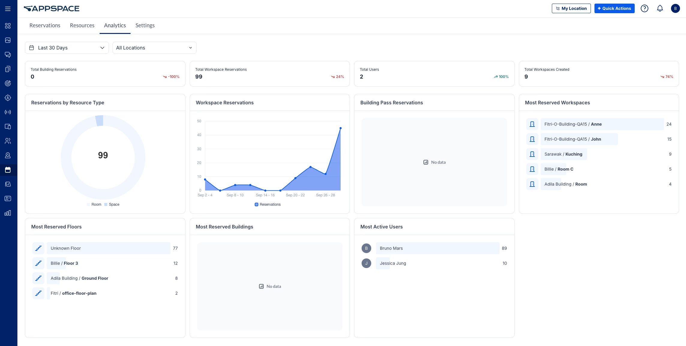 - Most Reserved Workspaces: Displays each reservation of the workspace with Event Date and User.