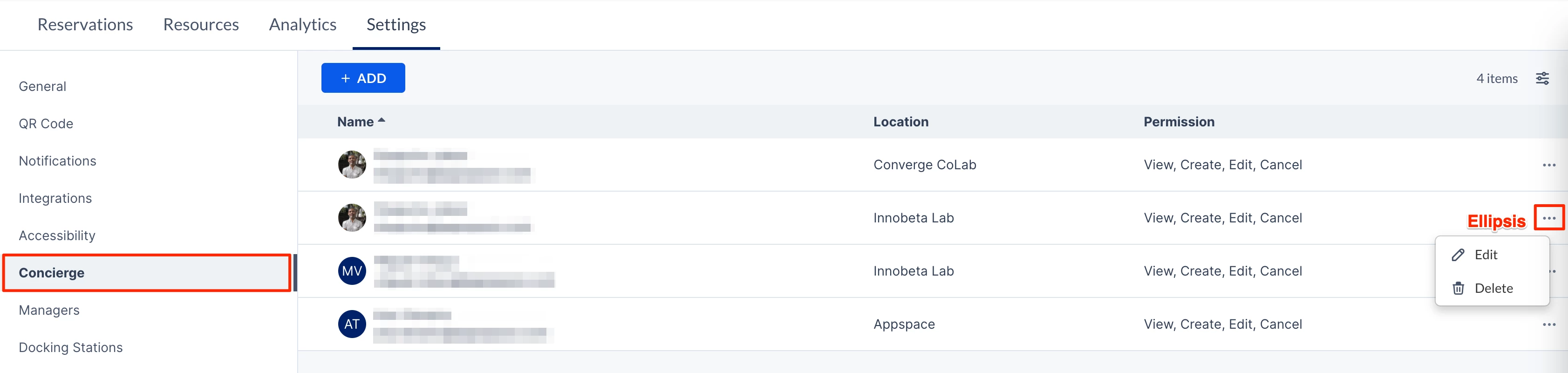 The Concierge Permissions setting option allows Admins to assign and configure Concierge permissions to users, providing them access and permissions to manage reservations through the Concierge dashboard.