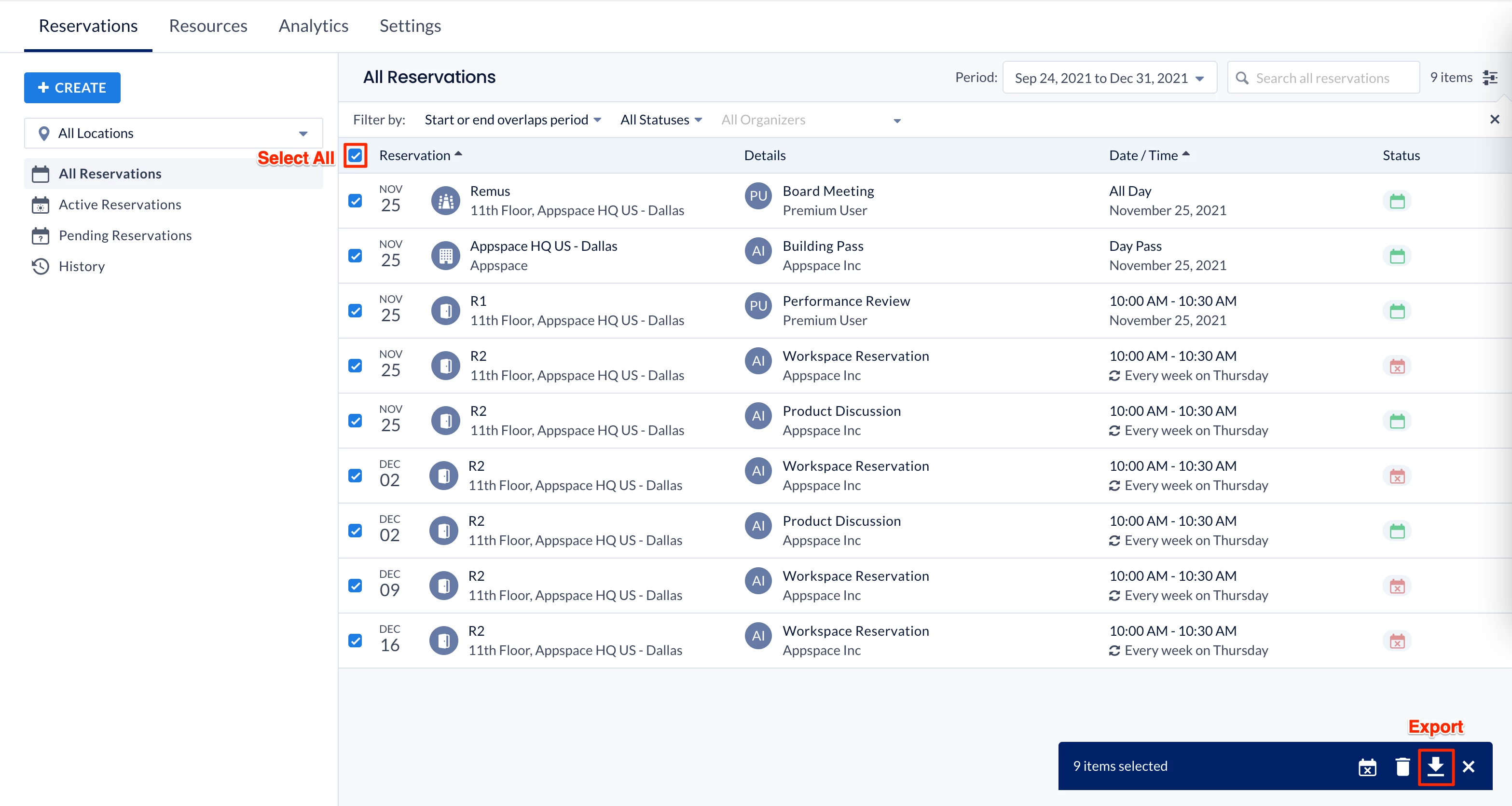 - Select the reservations you wish to export or click the checkbox to select all reservations.