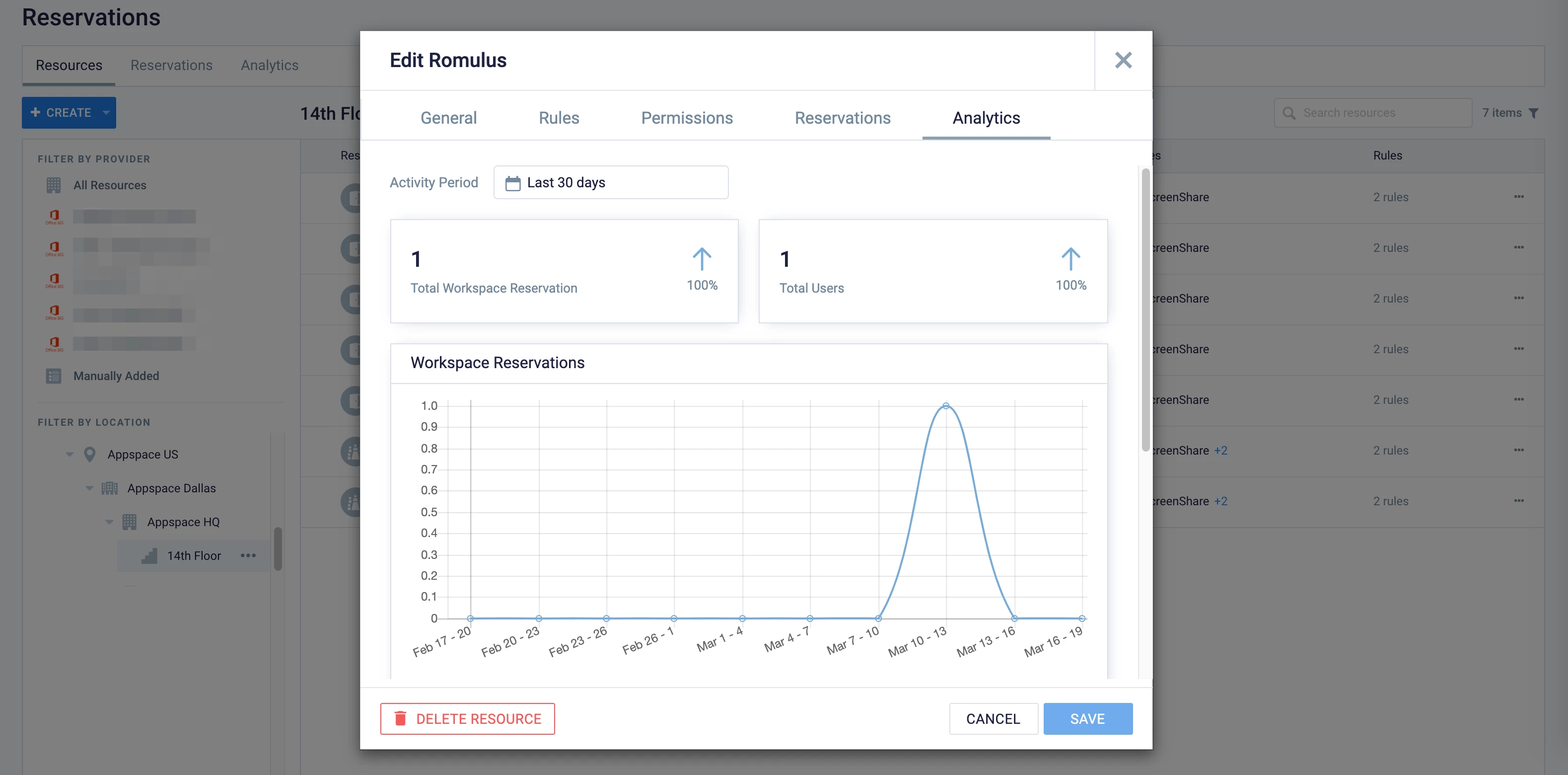 You may also view detailed analytics for an individual building, floor, or workspace resource by clicking the Analytics tab when editing the resource from the Resources tab.