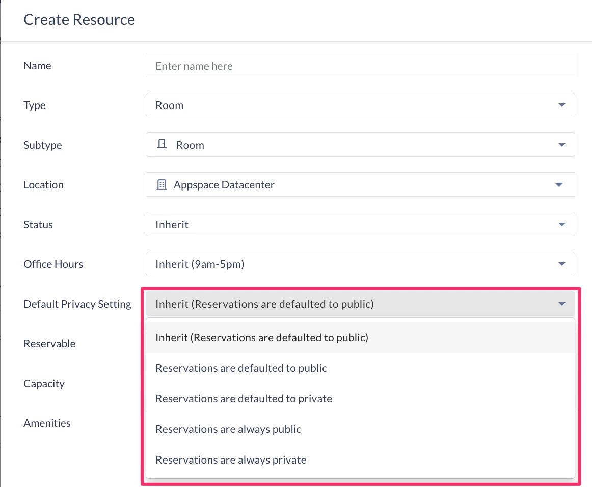 - Default Privacy Setting (New) – Set the privacy of reservations that use this resource.