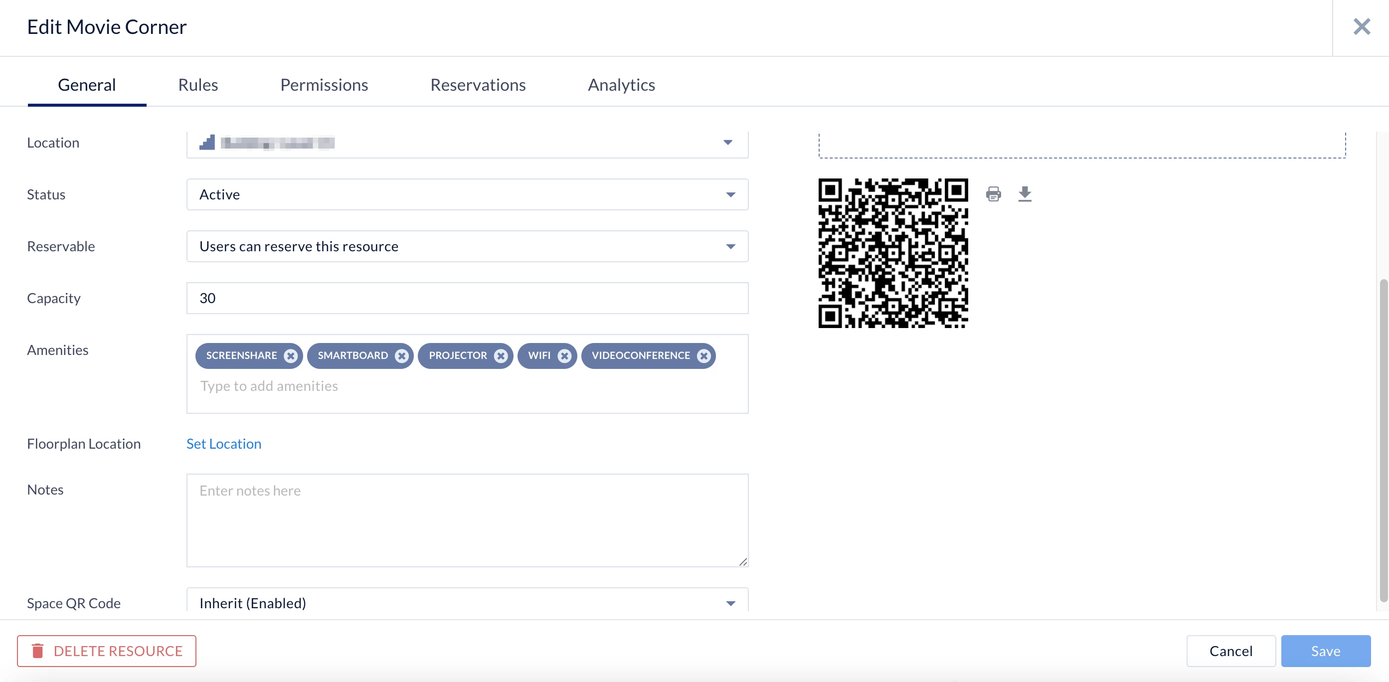 - The QR Code Settings for the resource is set to Inherit (Enabled) by default, and can be disabled from the drop-down menu.