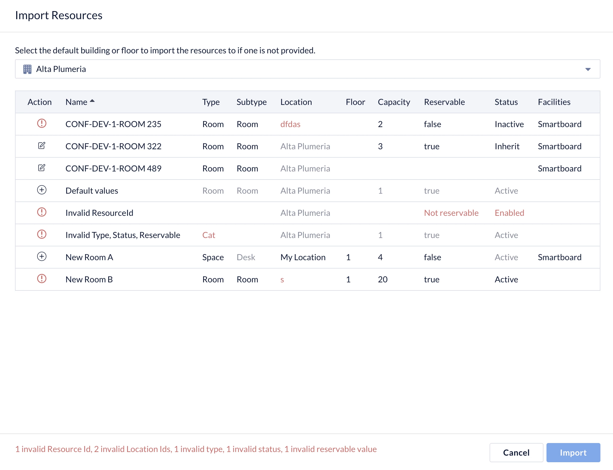 - Once the resource .xlsx file has been added, the Import Resources screen will display the summary of resources that will be imported to Reservations. Here, you may identify if the imported resource is a new resource, an update to an existing resource, or if the resource is invalid due to an incorrect value.