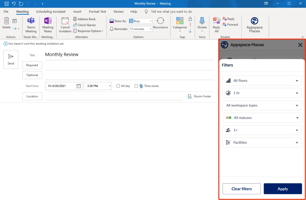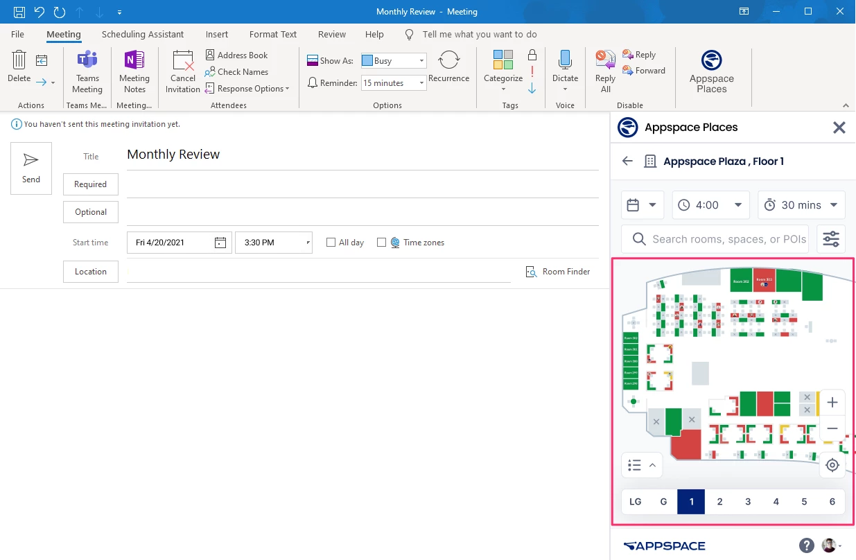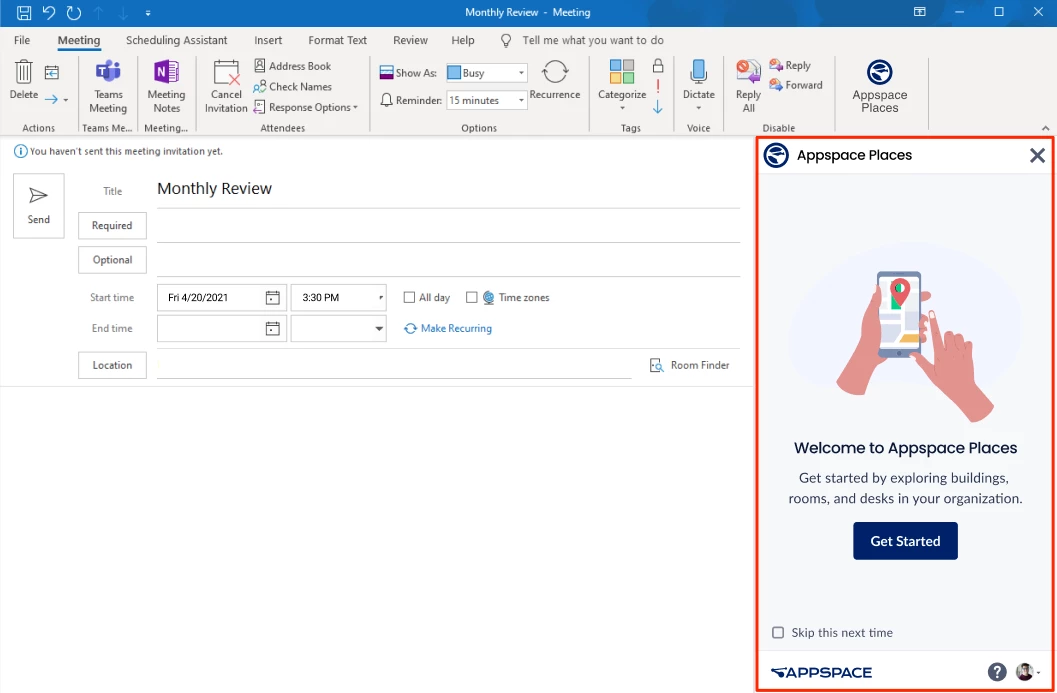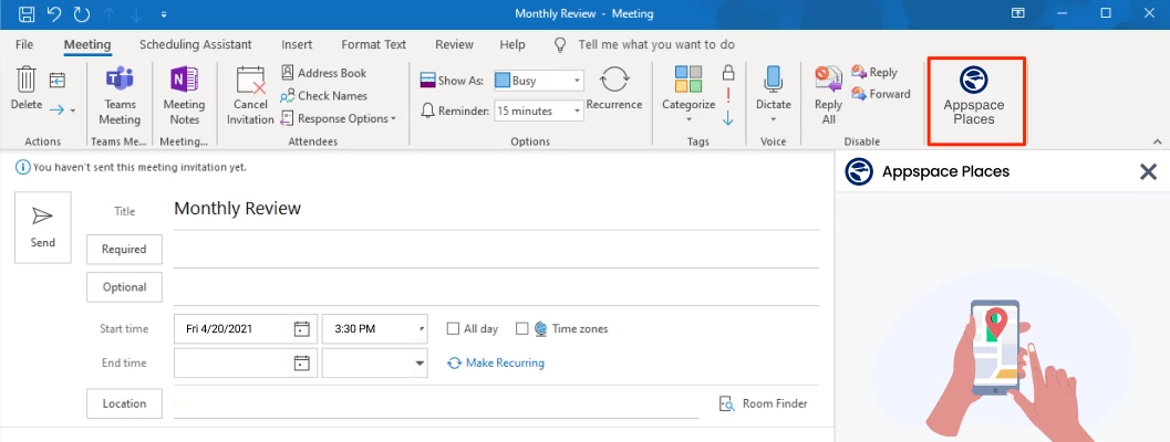 - Displays an Appspace Places button in the Appointment tab, on the Microsoft Outlook Meeting ribbon.