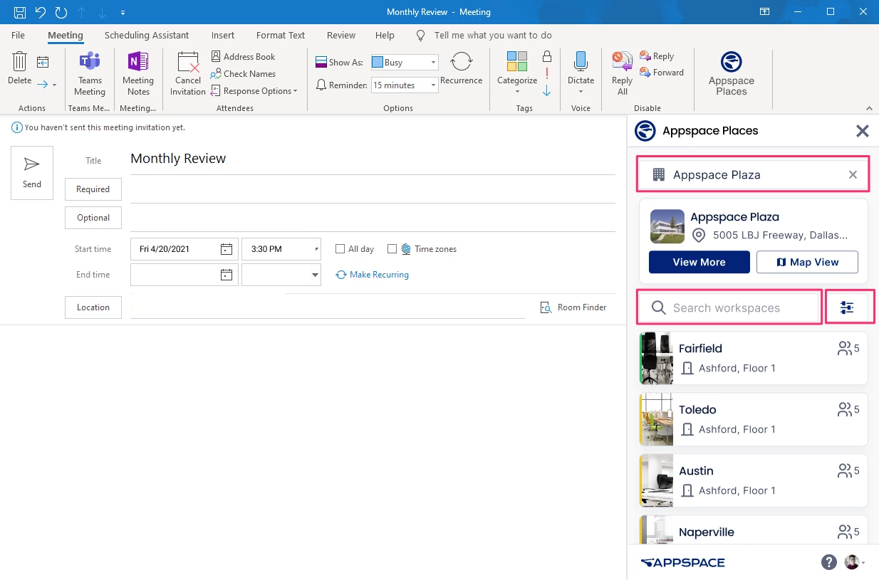 - Once the user selects a meeting space, the location field is updated with the appropriate Microsoft Exchange resource.