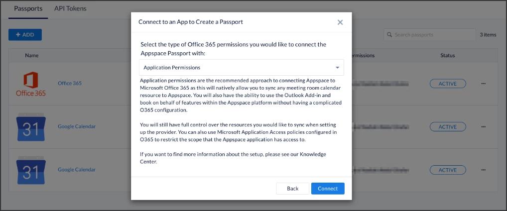 - Application Permissions – Application permissions are the recommended approach to connecting Appspace to Microsoft Office 365 (O365) as this will natively allow you to sync any meeting room calendar resource to Appspace. You will also have the ability to use the Appspace Places Outlook add-in and book on behalf of features within the Appspace platform without having a complicated O365 configuration. You still have full control over the resources you would like to sync when setting up the provider. You can also use Microsoft Application Access policies configured in O365 to restrict the scope that the Appspace application has access to.