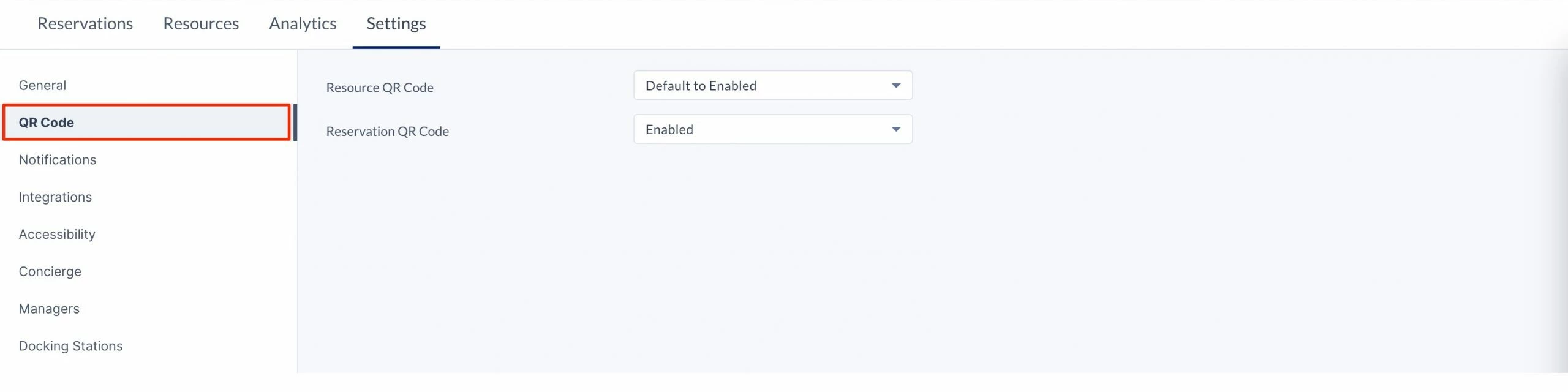 The QR Code Reservation settings can be accessed via the Settings > QR Codes tab within the Reservations module.