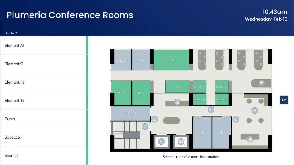 Employees and visitors can see the current schedule of multiple rooms or desks, and can select any of the workplace resources from the list or the floor map to make the desired reservation.