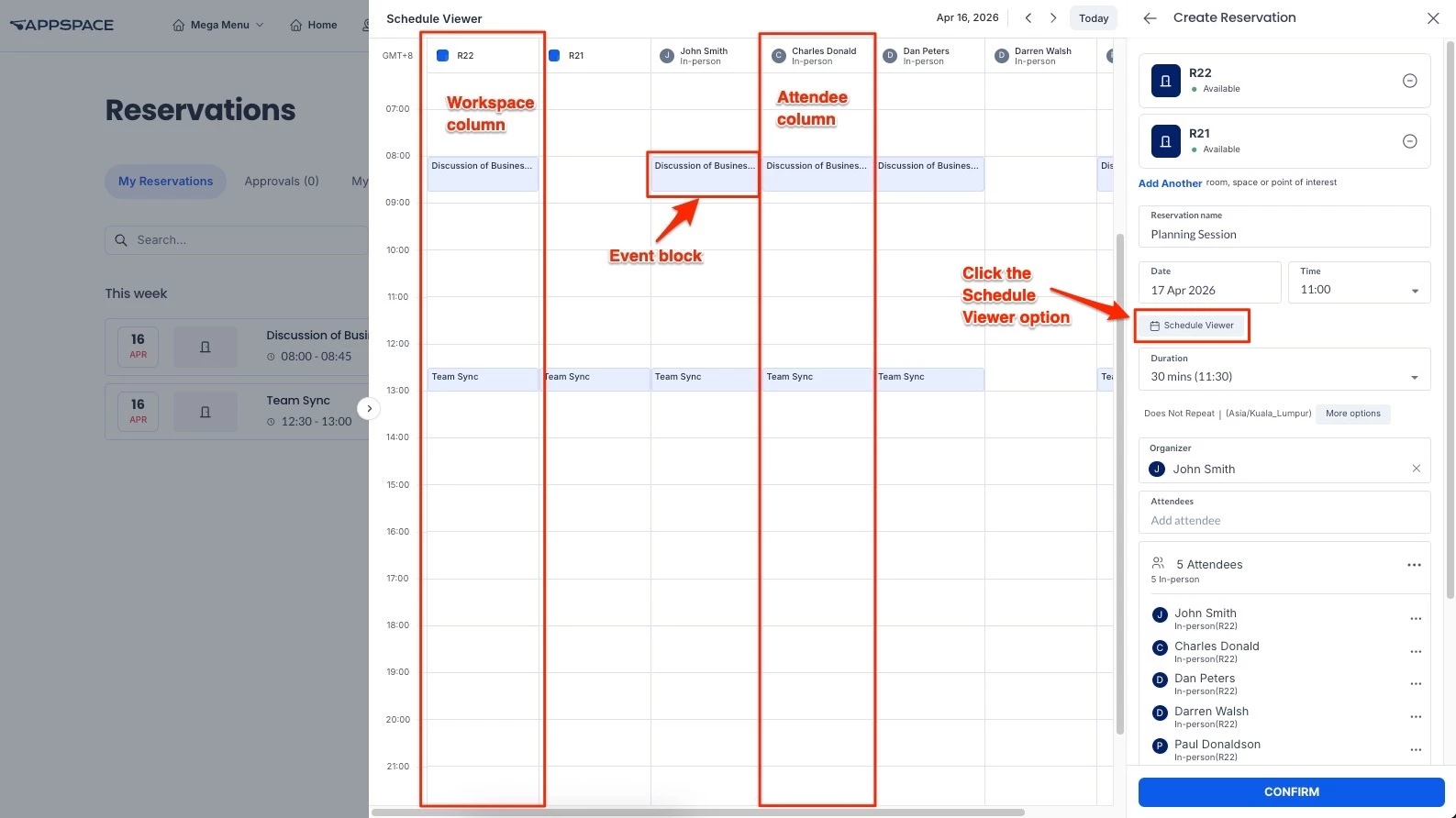 When the Schedule Viewer is displayed, you will see a calendar grid made up of event blocks, which represent scheduled reservations. side-by-side timeline view / grid of all invitees (including visitors), allowing you to visually view available time within the resource and its attendees, as well as occupied time blocks.