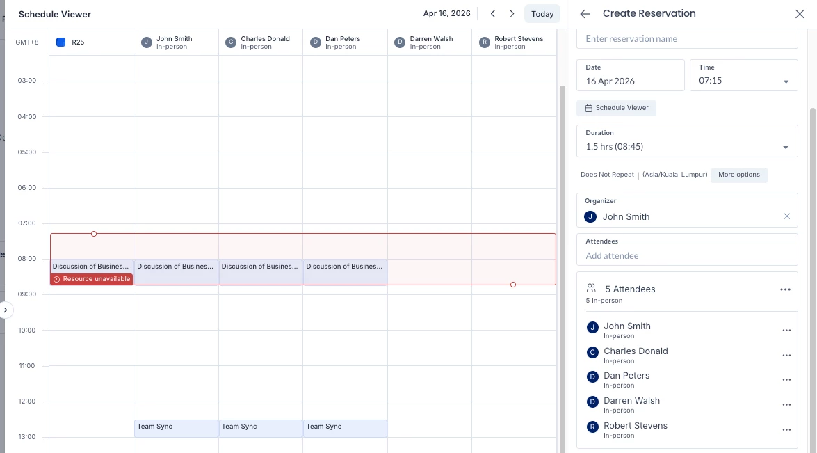 - Real-time integration with connected calendar systems (e.g., Microsoft 365 or Google Workspace) to display resource and attendee availability.