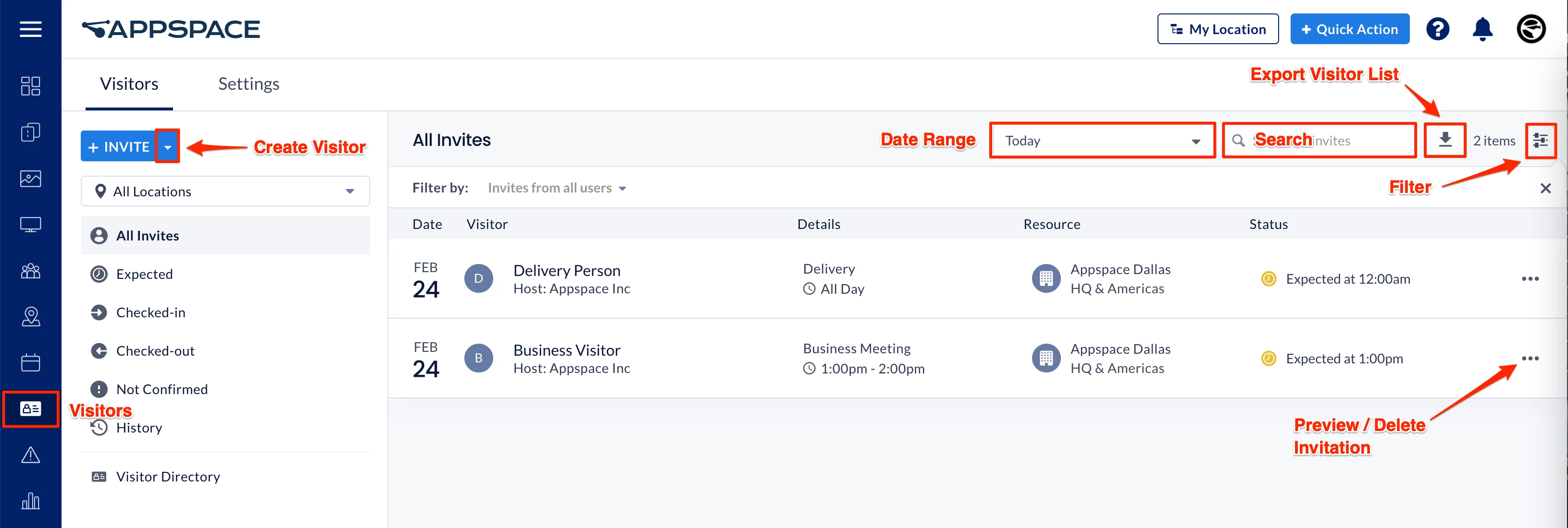 - The + INVITE button allows you to send visitor invitations directly from the Appspace console.