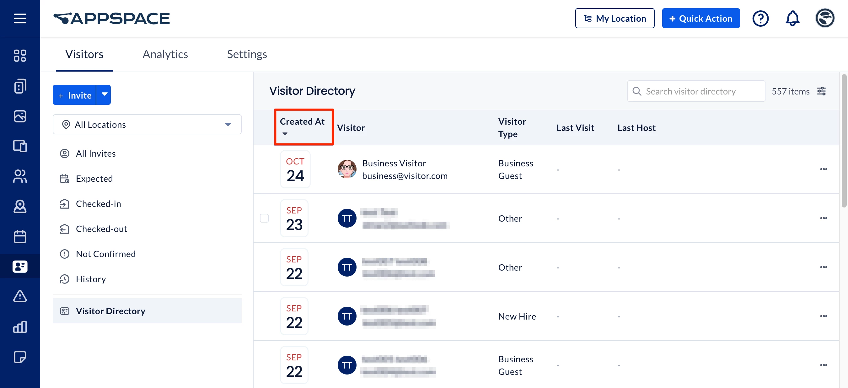 In the Visitor Directory, you can sort the listed visitors in descending order by clicking the headers. Click the header again to sort them in ascending order.