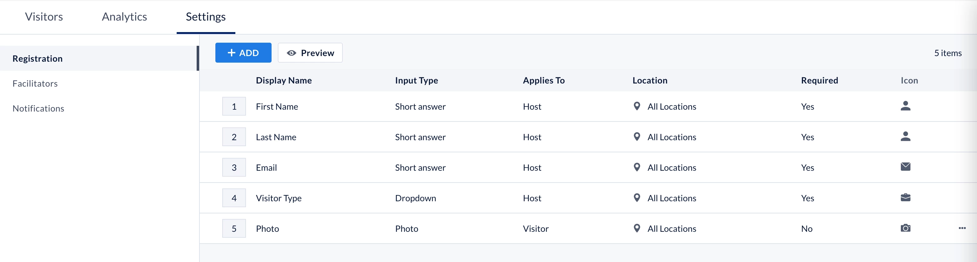 The Settings tab, allow administrators to configure the Visitor Registration form, and the following visitor management settings: