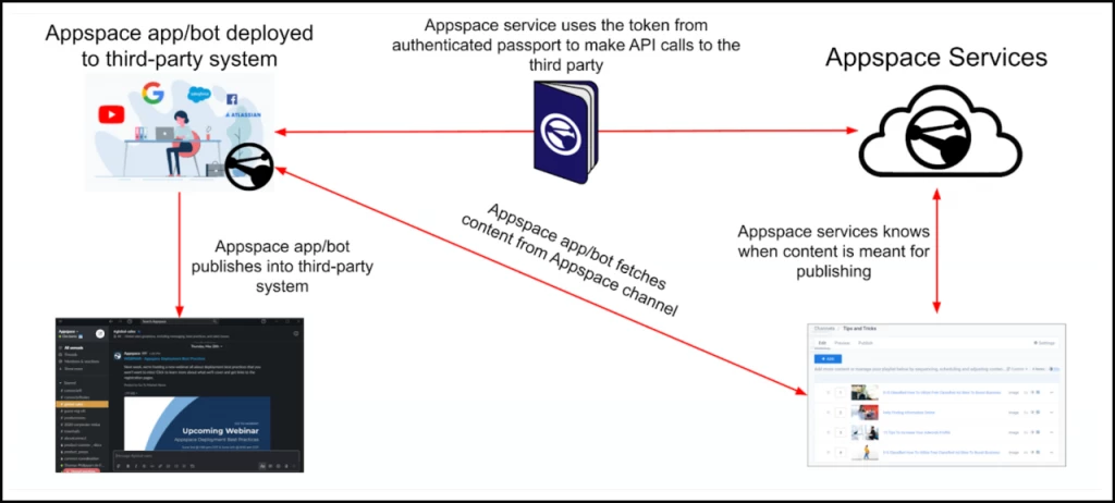 In order to publish content from Appspace to these enterprise messaging apps (Microsoft Teams, Webex Teams, Workplace from Meta, and Slack), the Appspace Account Owner will have to link their Appspace account to the app they use. They do this by creating an integration using an authentication passport in the Appspace console.