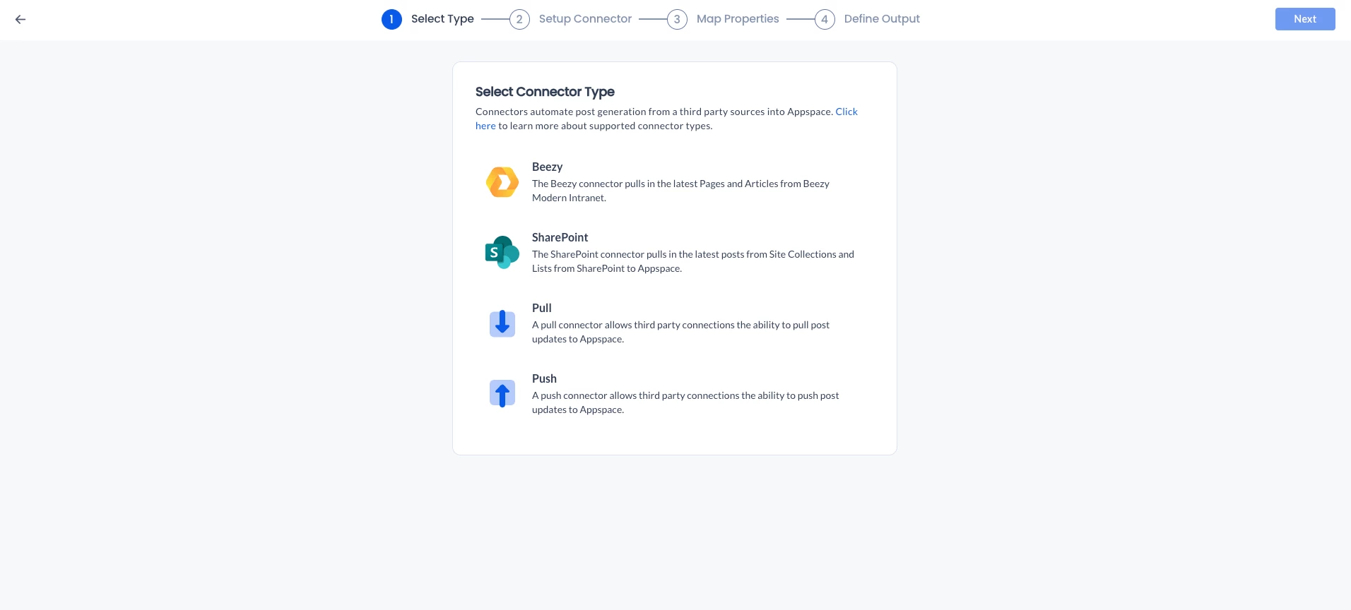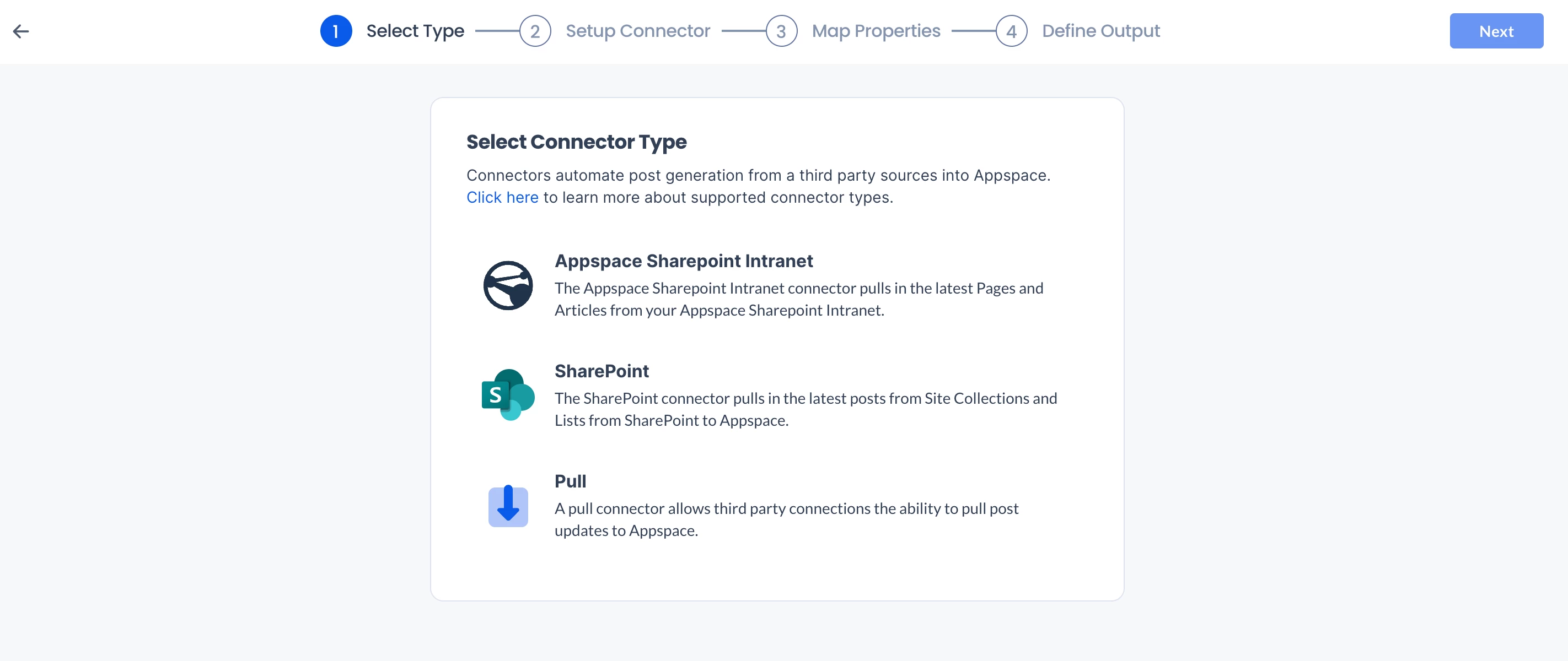 - Properties – Allow the user to map the connector data source properties to Appspace post properties.