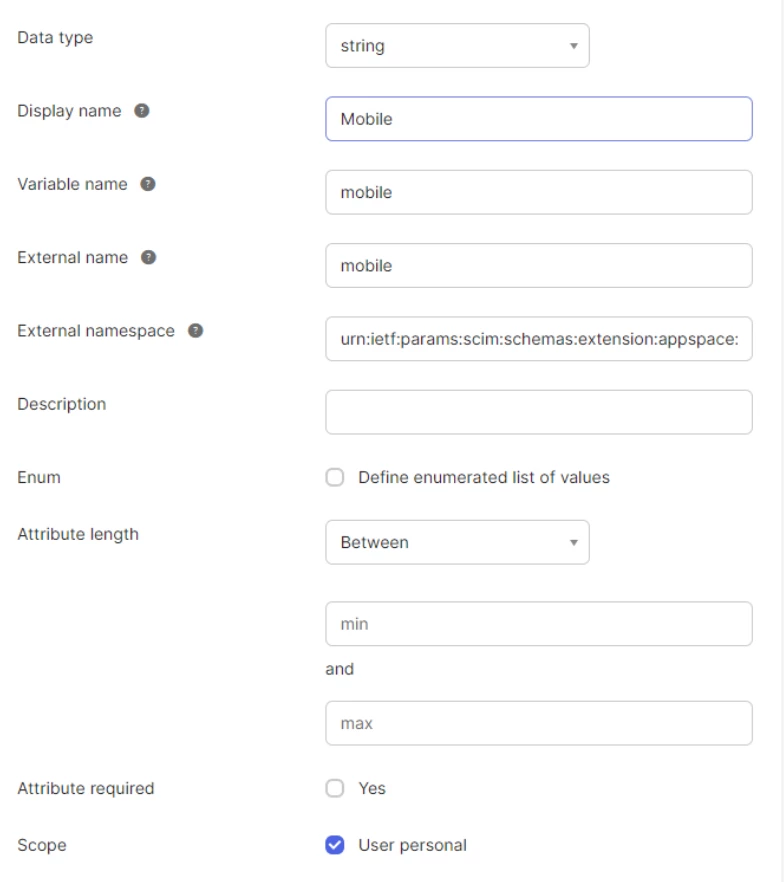 | External Namespace | urn:ietf:params:scim:schemas:extension:appspace:2.0:User |