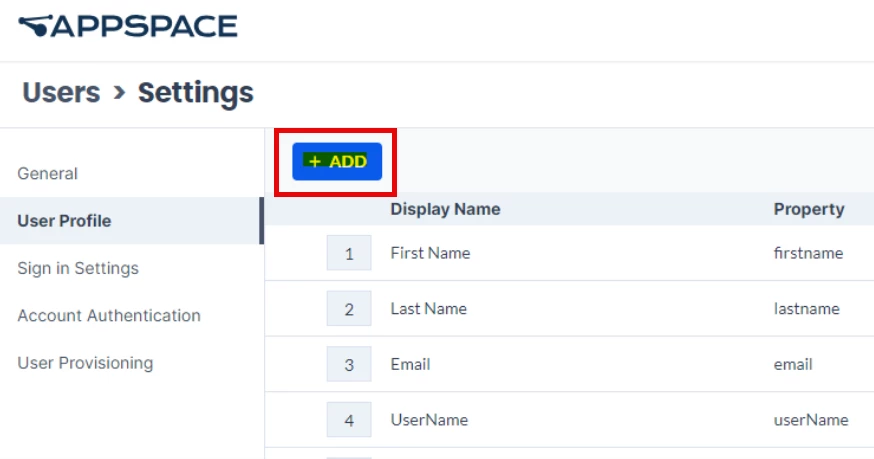 - In Appspace, navigate to Users > Settings > User Profile.