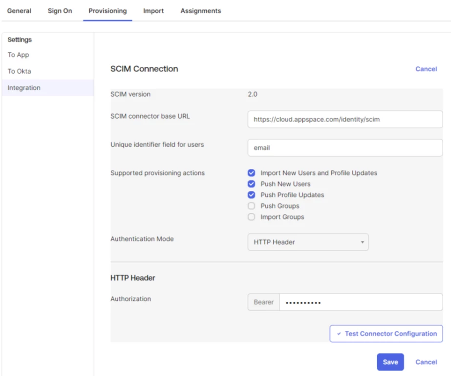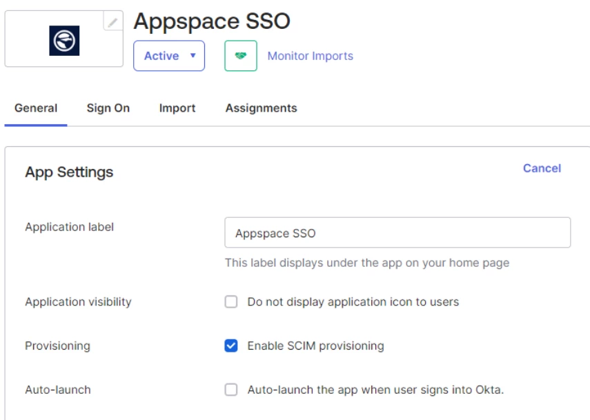 This article walks through how to configure SCIM (System for Cross-domain Identity Management) provisioning between Okta and Appspace. Once set up, users assigned to the Appspace app in Okta will be automatically provisioned, updated, and deactivated in Appspace without manual intervention.