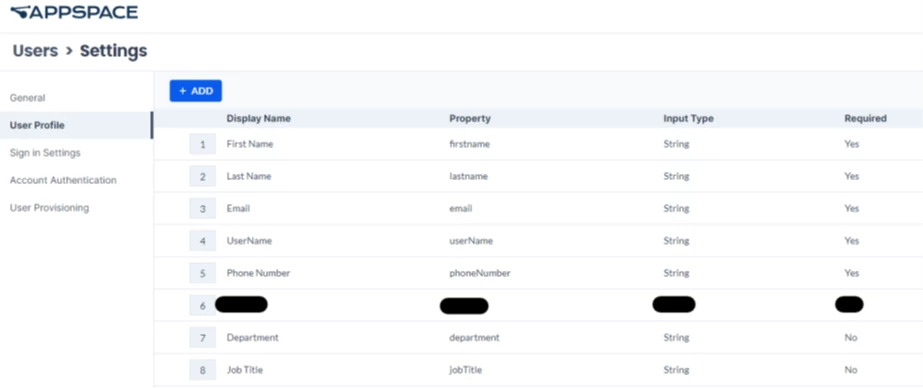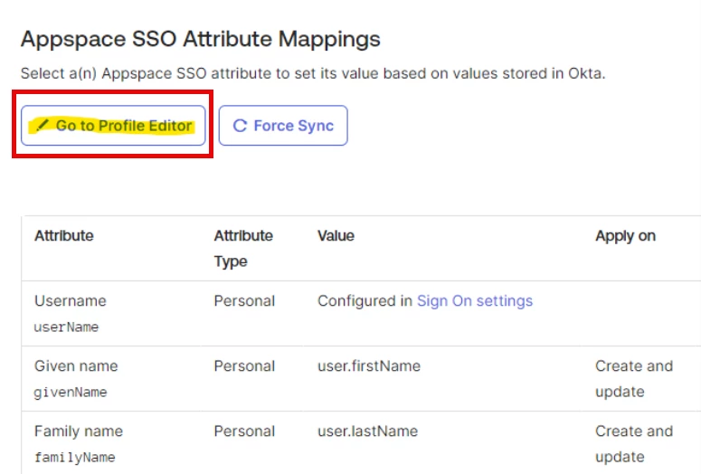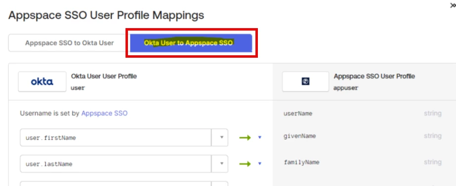 The following attributes are automatically mapped from Okta to Appspace by default. These can be reviewed in Appspace under Users > Settings > User Profile.