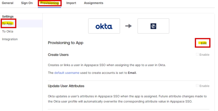 - Select the Provisioning tab > To App > Edit.