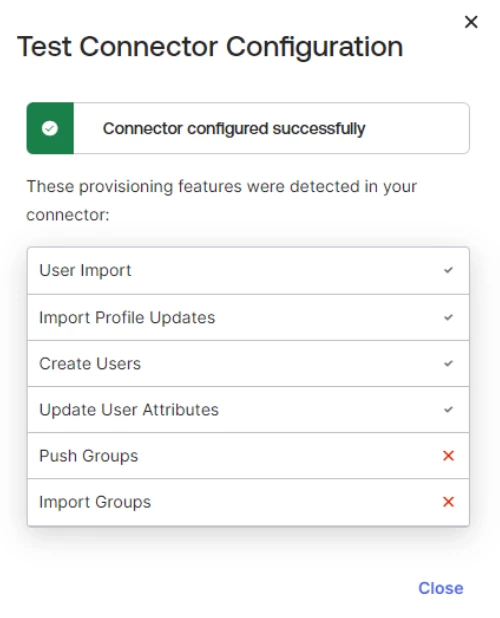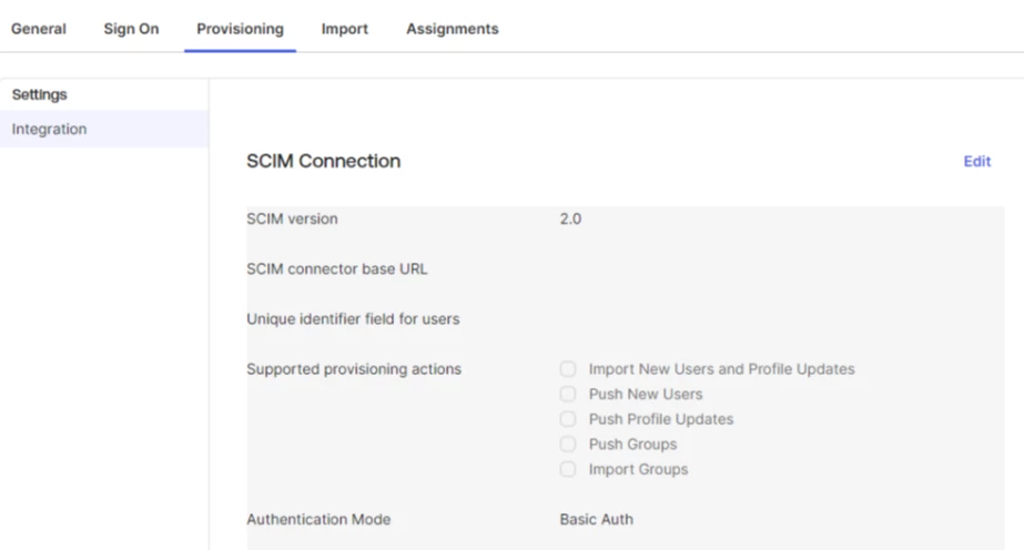 | Supported provisioning actions | Select Import New Users and Profile Updates, Push New Users, and Push Profile Updates |