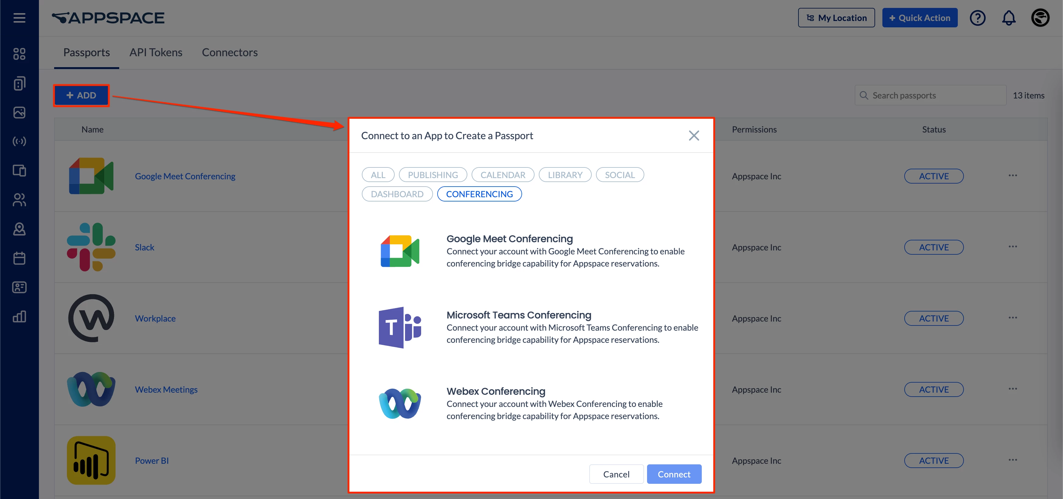 - In the Passports tab, click the +ADD button, and click the CONFERENCING filter.