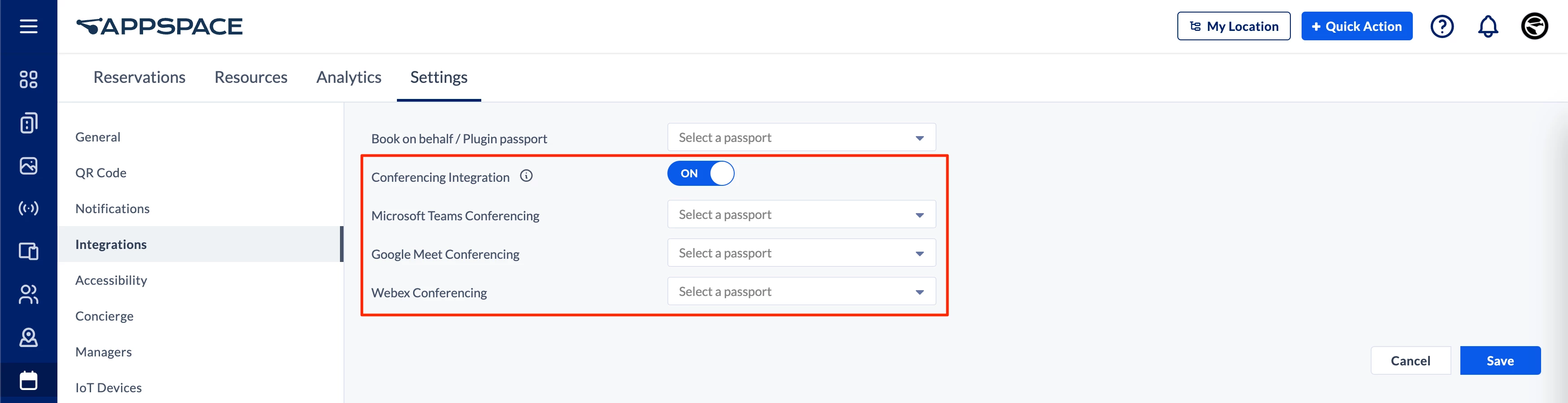 - Ensure the Conferencing Integrations is enabled (ON), and proceed to select the conferencing passports that have been configured from the respective drop-down menus.