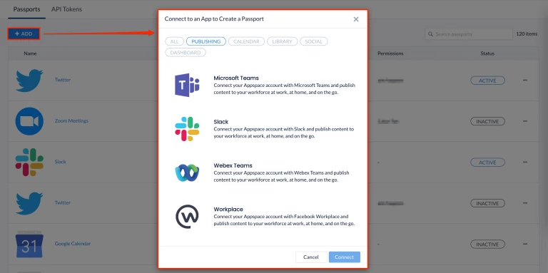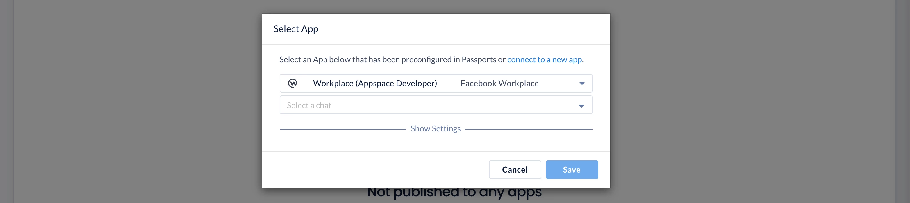 - In the Select an App to Create a New Passport window, click Workplace. You may click the PUBLISHING tag to filter results.