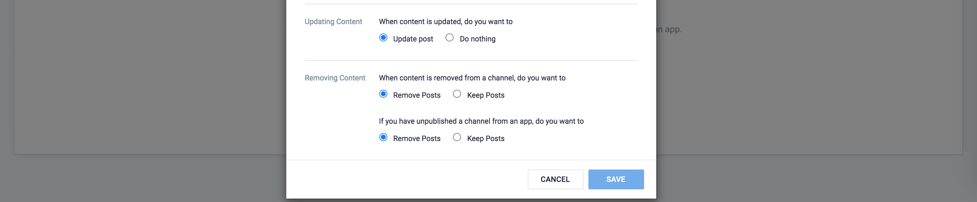 - In the Updating Content section, select what happens when the posted content is updated (after the post was initially published) in the Appspace console:
