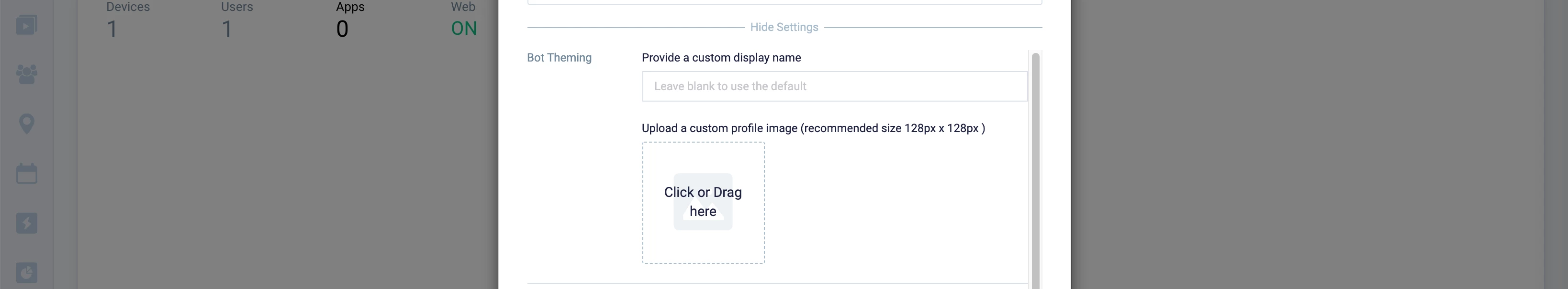 - In the Bot Theming section, you may configure your company name and logo. When posts are made to a Workplace group, the message will include this name and image. The default name is Appspace.