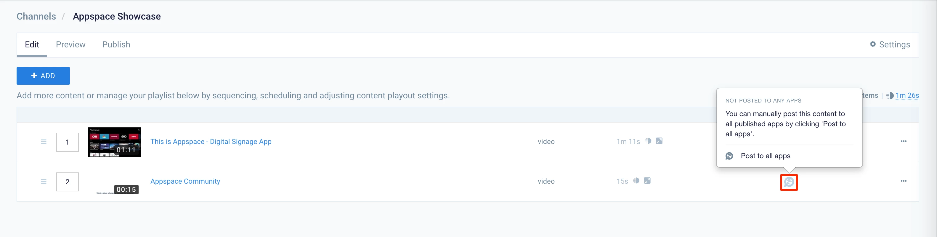 Publishing to Apps is only available for playlist channels. Appspace Account Owner or a channel Publisher permissions are required.