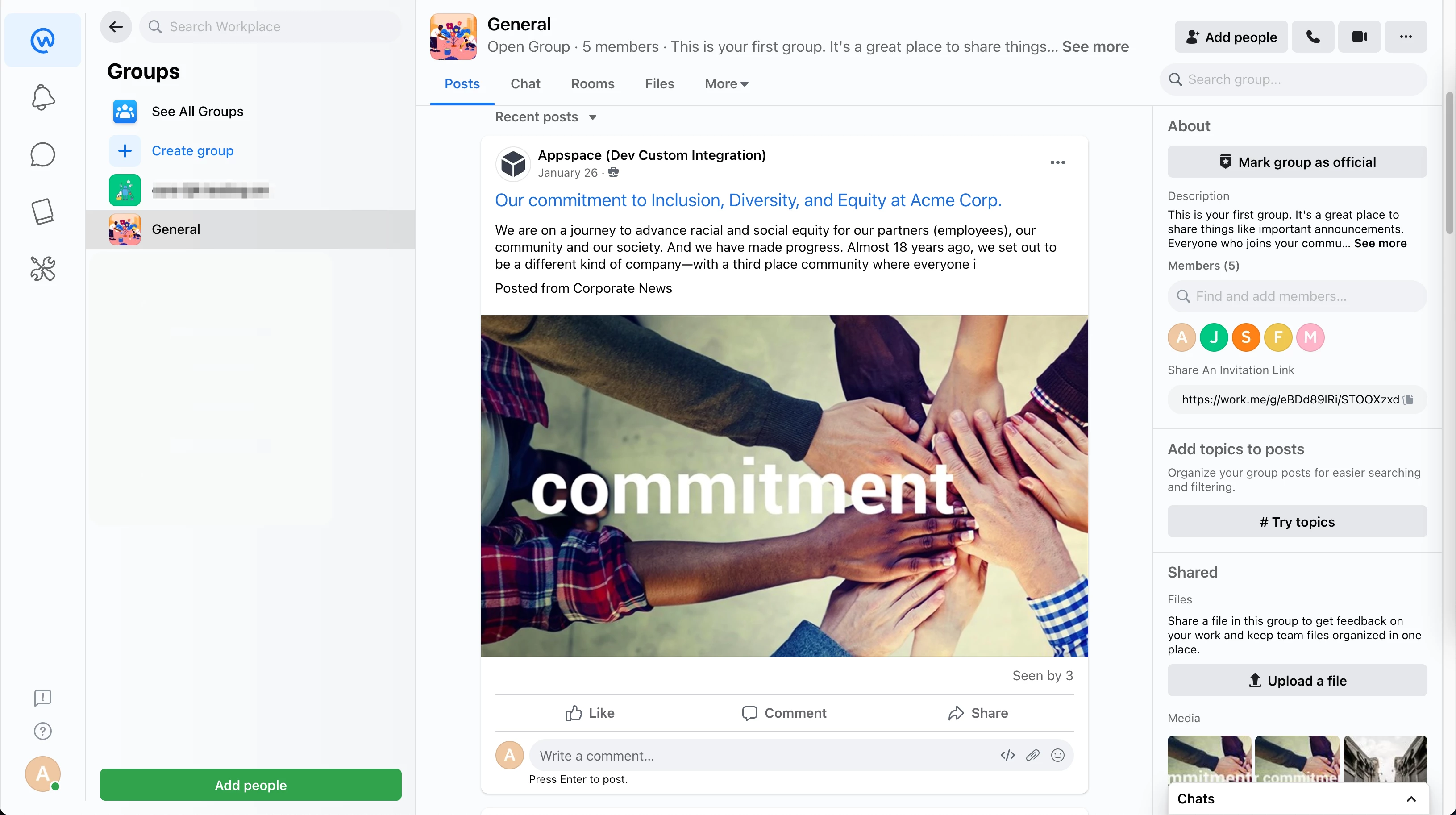 - Do nothing – User reads posted content in the Workplace group. No other action is available.