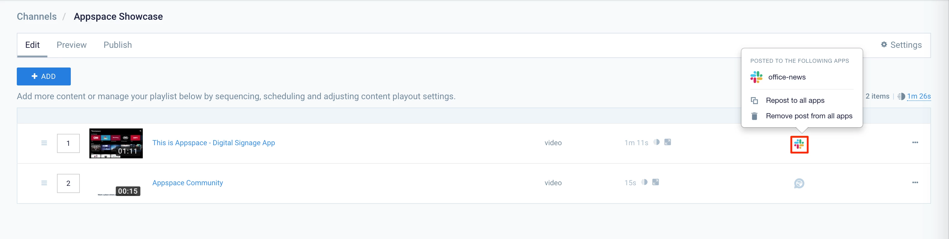 - Appspace playlist channel(s). Only a playlist channel is supported for this integration.
