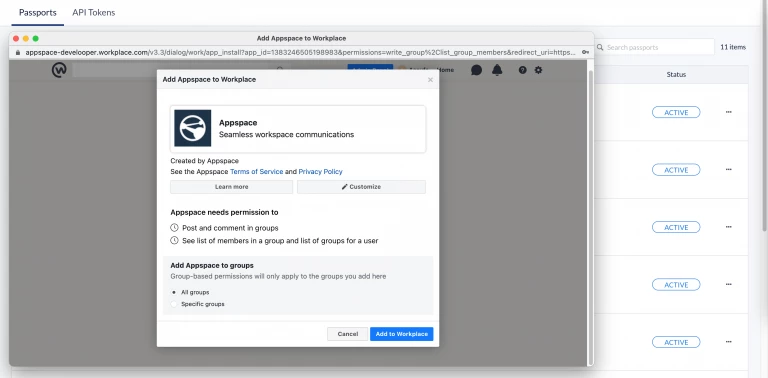 - We request granular access to your organization. Appspace does not request broad permissions to your organization. The integration only has the permissions required to perform its operation, which is to post content from the Appspace console into the Workplace group.