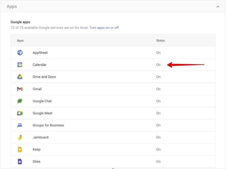 In the user page, select the group panel with apps; it will bring you to the apps page. Confirm that the calendar row is on.