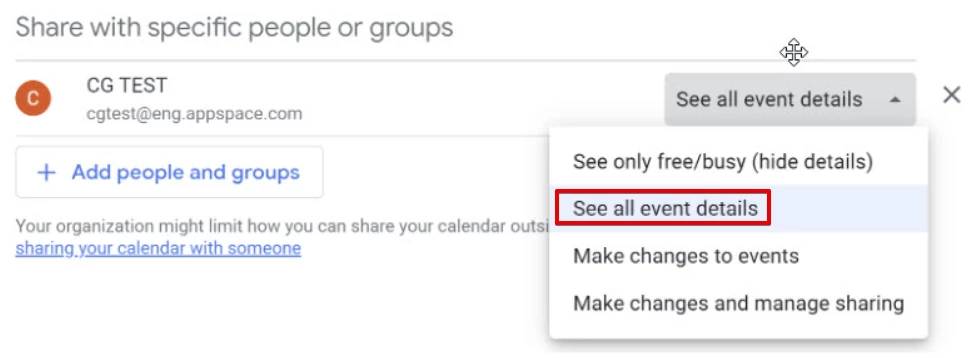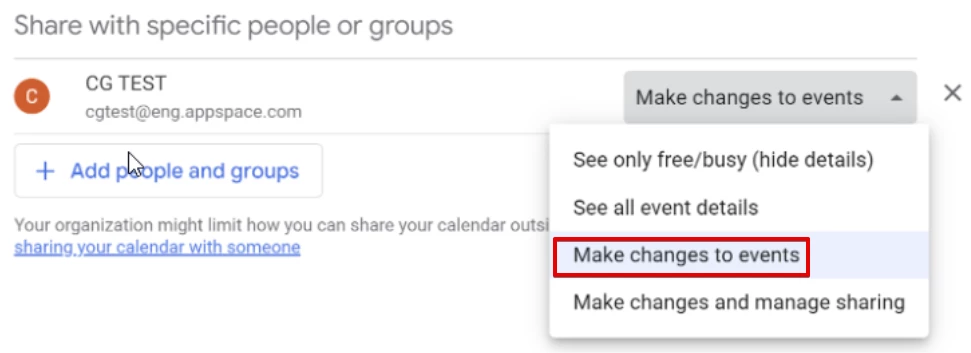 Note: If you would like to enable the Book On Behalf feature from Appspace, your GCal administrator should ensure that the service account has read and write access to the user calendar.