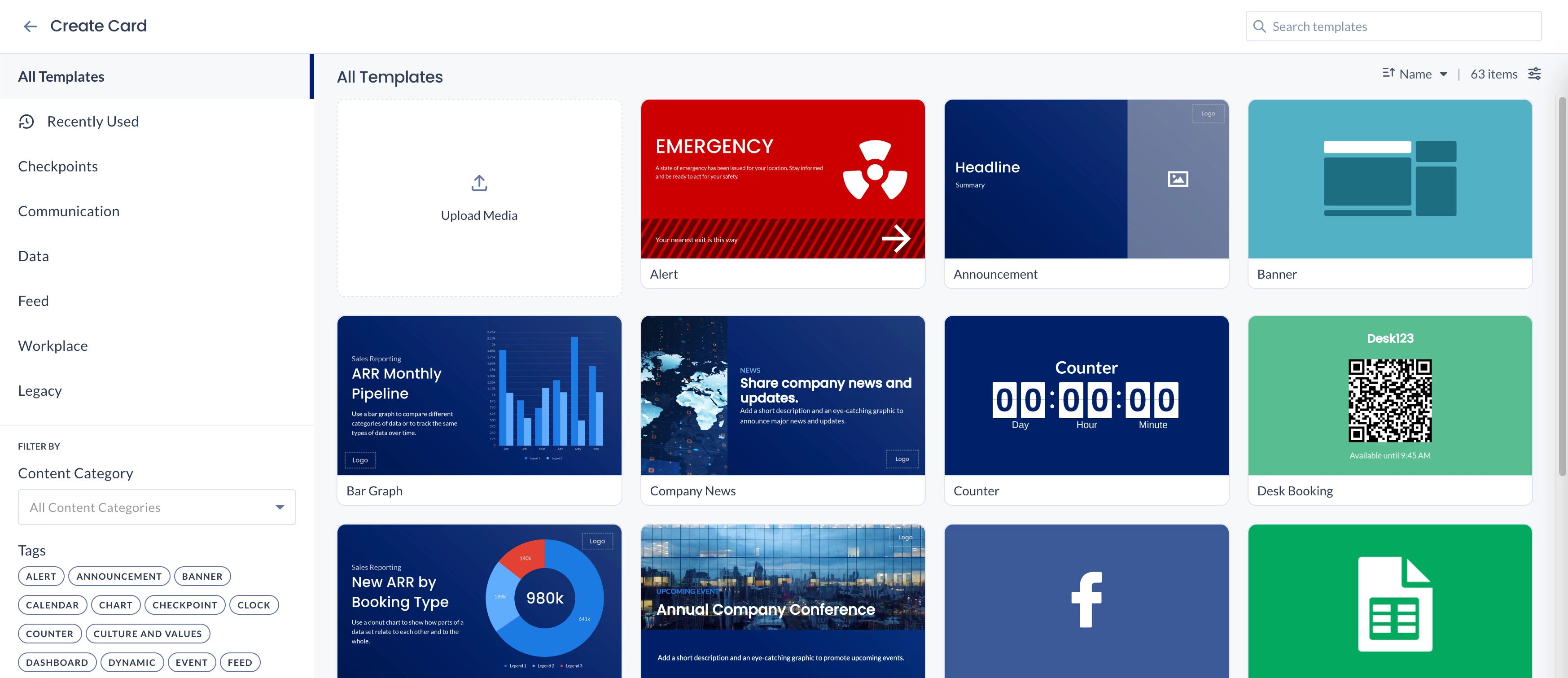 If you’re unable to locate the desired card content, you may use the Search bar, Template type, Filters, or Tags available in the side panel.
