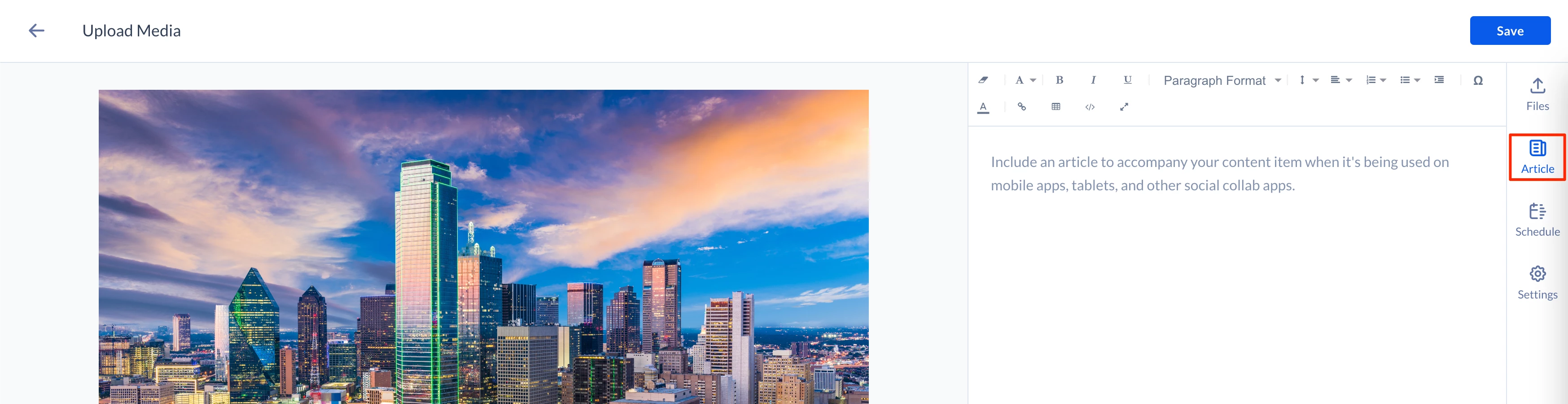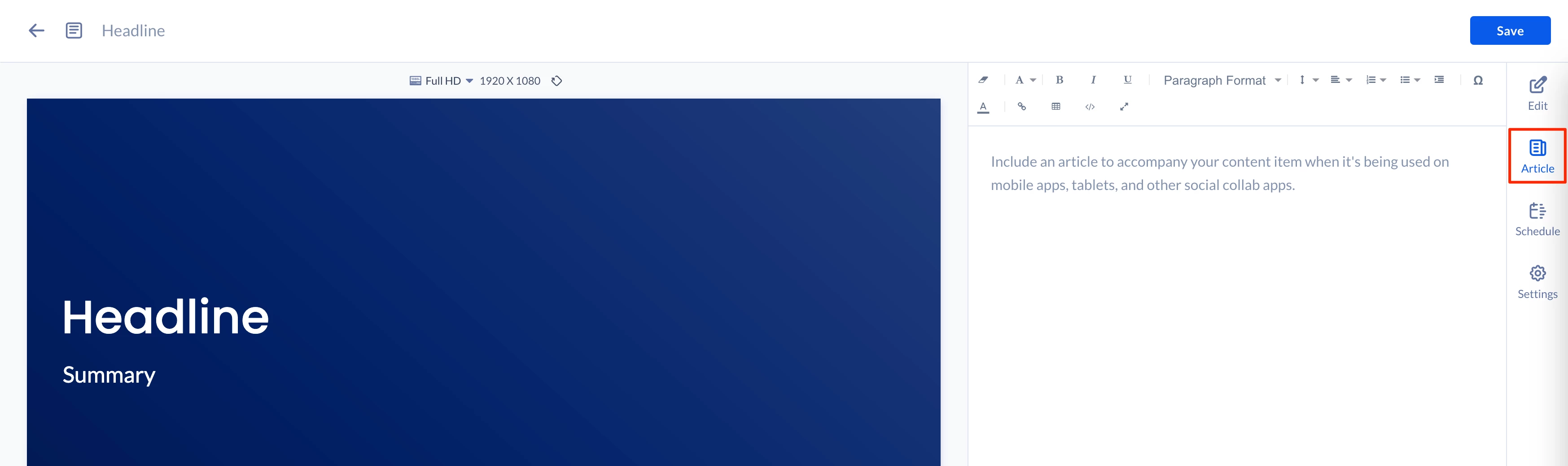 - You may enter an Article or Caption that accompanies the content when viewed in the Employee View or Third-Party Enterprise Messaging Apps.